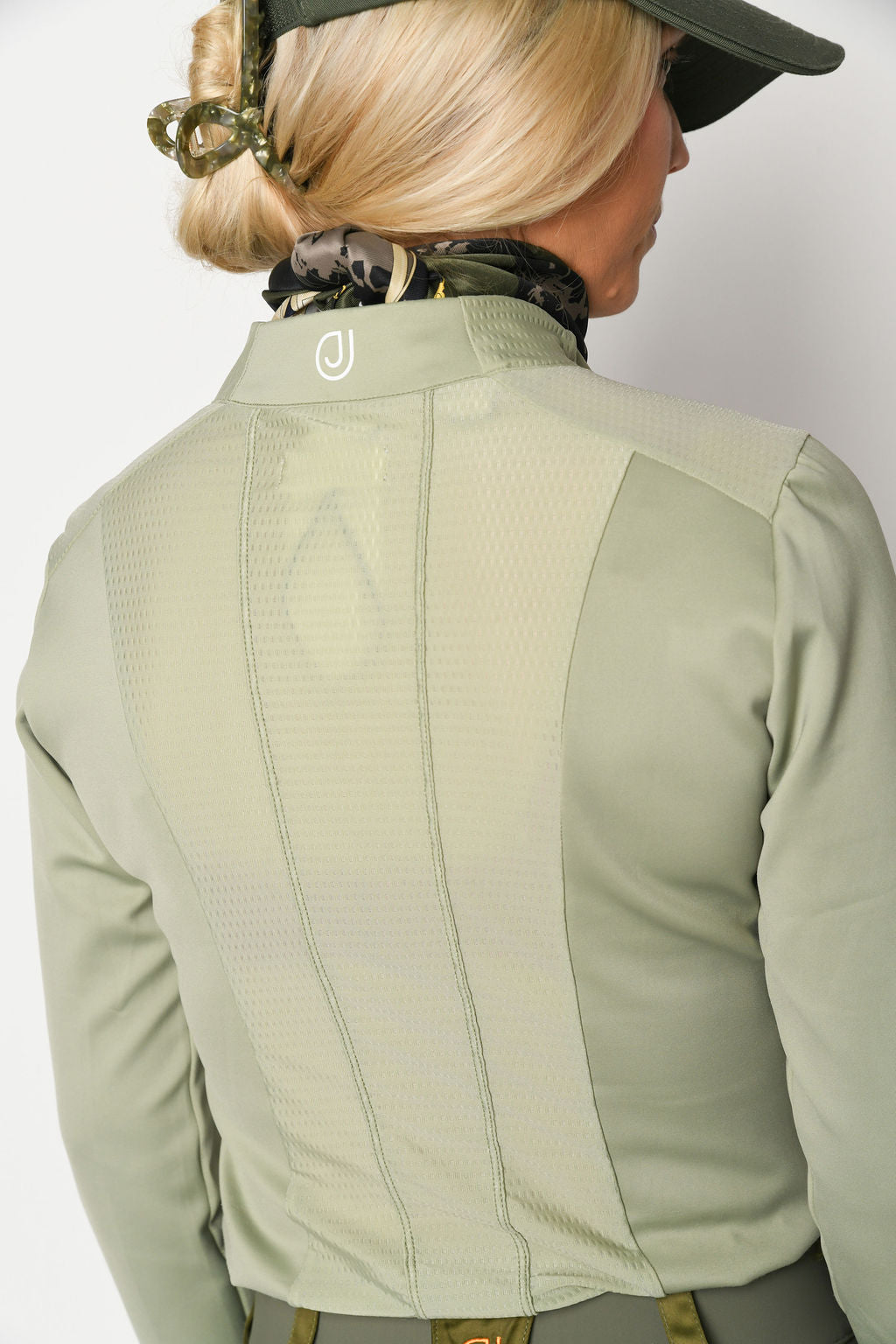 This form-fitting shirt is crafted from a lightweight, stretchy material and cooling mesh panels that moves with you, providing comfort and functionality in the saddle. Perfectly balancing athleticism with elegance, this shirt can be worn by itself or as a comfortable base layer under a sweater, coat or vest.